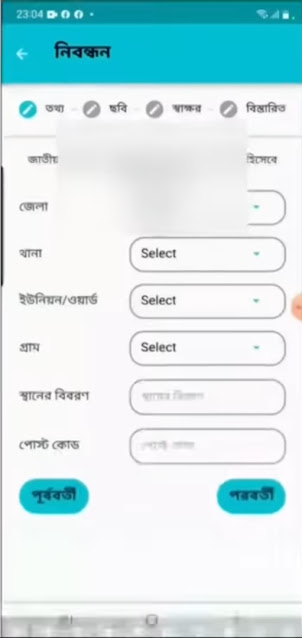 এখন যেহেতু রেজিস্ট্রেশন করার সময় আপনার এনআইডি কার্ডের তথ্যগুলো যাচাই করেছেন সেহেতু এখন অটোমেটিক আপনার তথ্যগুলো চলে আসবে আপনি শুধু দেখবেন যে জেলার নাম, থানা, ইউনিয়ন, গ্রাম এবং পোস্ট কোড সঠিক আছে কিনা।