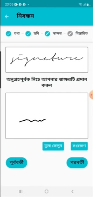 এখন এখানে একটা সিগনেচার করতে হবে এবং এই সিগনেচার টি ফোনের ওপর নির্দিষ্ট সিমানার মধ্যে আঙ্গুল ঘুরিয়ে সিগনেচার টি করতে হবে এখন সিগনেচার টি সংরক্ষণ বাটনে ক্লিক করার পর পরবর্তী বাটনে ক্লিক করতে হবে।