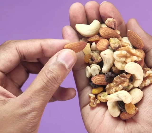 যেমন চিনা বাদাম, কাঠ বাদাম, কাজু বাদাম, পেস্তা বাদাম, বল নাট ইত্যাদি এগুলোতে আছে স্বাস্থ্যকর ফ্যাট। বিশেষ করে ওমেগা সিক্স প্যাক যা চুলের গোড়ার চুল লম্বা করতে সাহায্য করে। এই ওমেগা সিক্স প্যাক আমাদের শরীর নিজে থেকে তৈরি করতে পারে না, এগুলো খাবার থেকে নিতে হয়। এই ওমেগা সিক্স প্যাকের অভাবে মাথার চুল পড়ে যায়, চুলের রং হালকা হয়ে যায়। তাই প্রতিদিনের নাস্তায় কিছু বাদাম রাখতে পারেন। তবে অনেক পরিমাণে খাবেন না তাহলে ওজন বেড়ে যেতে পারে।