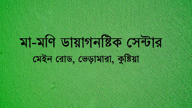 মা-মণি ডায়াগনষ্টিক সেন্টার হাই রোড, ভেড়ামারা, কুষ্টিয়া মোবাইলঃ 01718-408544, 01725-352508 ( বিস্তারিত তথ্য জানতে ও সিরিয়ালের জন্য ) মা-মণি ডায়াগনষ্টিক