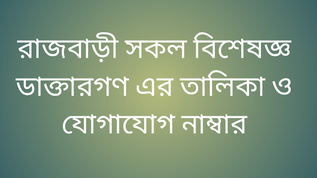 রাজবাড়ীর বিশেষজ্ঞ ডাক্তারগণ এর তালিকা মেডিসিন বিশেষজ্ঞ ডাক্তারগণ ডাঃ এম.এম. শাহিন উল ইসলামএমবিবিএস, এফসিপিএস (মেডিসিন) এমডি (গ্যাস্ট্রোএন্টারলোজি)মেডিসিন, পরিপাকতন্ত্র ও লিভার